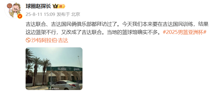 “吉达联合、吉达国民俩俱乐部都拜访过了。今天我们本来要在吉达国民训练,结果这边篮架不行,又改成了吉达联合。当地的篮球馆确实不多。”该媒体人在社媒上写道。